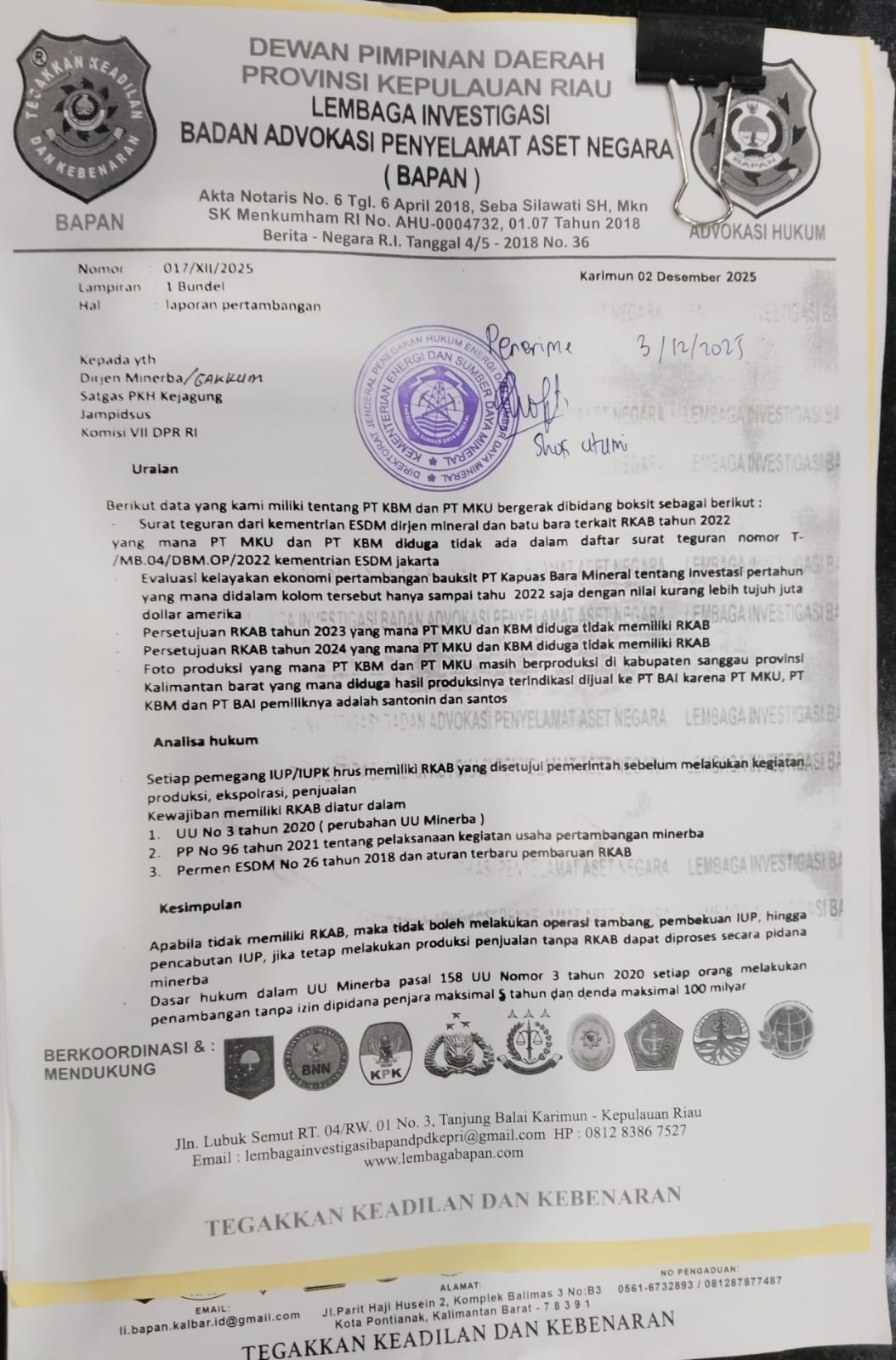Selain itu, BAPAN menemukan bahwa PT MKU dan PT KBM diduga tidak memiliki RKAB tahun 2023 dan 2024, namun produksi masih terus berjalan di lapangan.Ahmad Iskandar Tanjung, perwakilan DPD Kepri BAPAN, mengungkapkan alasan pelaporan tersebut dilakukan, Ia menilai pemerintah harus bergerak cepat karena potensi kerugian negara dari aktivitas tambang ilegal tidak bisa dianggap kecil.